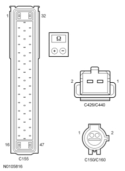 - For DTC C1155, measure the resistance between LF wheel speed sensor C150-1, circuit RCA17 (YE), harness side and LF wheel speed sensor C150-2, circuit VCA03 (VT/WH), harness side.