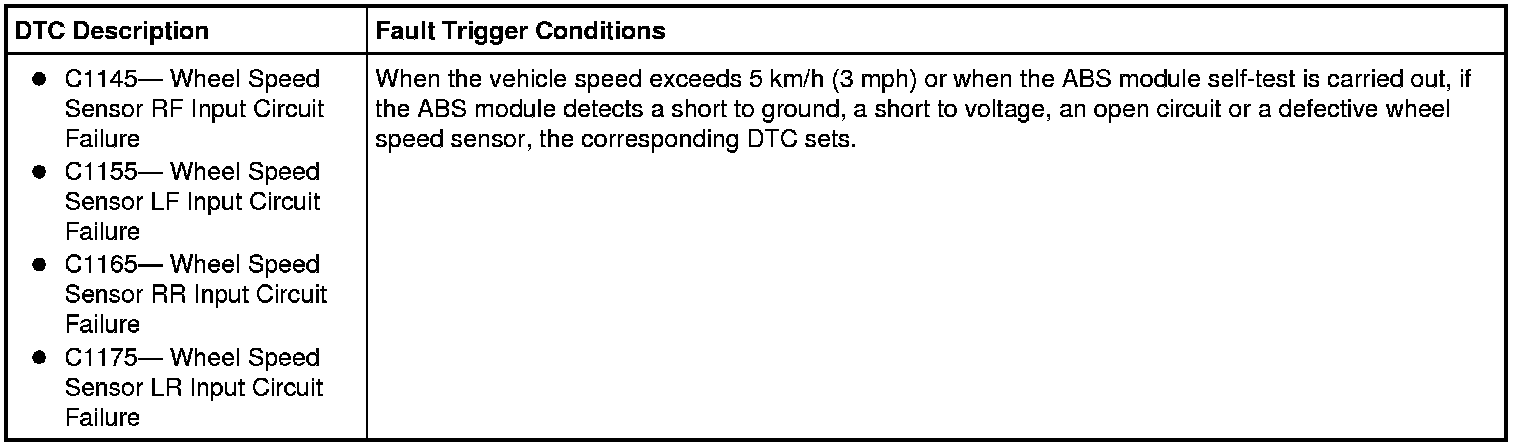 ABS Module Circuit Wheel Speed Sensor DTC C1145- Wheel Speed Sensor RF Input Circuit Failure C155-34 VCA05 (GY/VT) C160-2 C155-33 RCA19 (VT) C160-1 DTC C1155- Wheel Speed Sensor LF Input Circuit Failure C155-45 VCA03 (VT/WH) C150-2 C155-46 RCA17 (YE) C150-1 DTC C1165- Wheel Speed Sensor RR Input Circuit Failure C155-43 VCA06 (WH/OG) C426-1 C155-42 RCA20 (BN) C426-2 DTC C1175- Wheel Speed Sensor LR Input Circuit Failure C155-36 VCA04 (BU/OG) C440-1 C155-37 RCA18 (BN/GN) C440-2