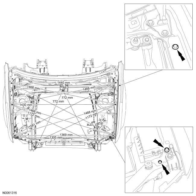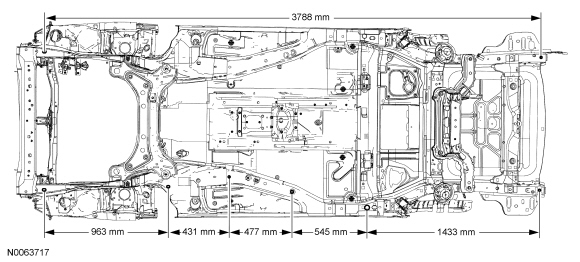 NOTICE: A structural frame rail service kit is not available for this vehicle. The frame rail cannot be sectioned. It is mandatory that the replacement section be installed as delivered at the original factory seam locations or collision energy management may be compromised.