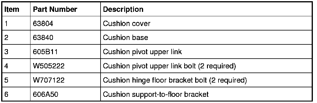 5. Remove the 2 cushion hinge floor bracket bolts and cushion support-to-floor bracket.