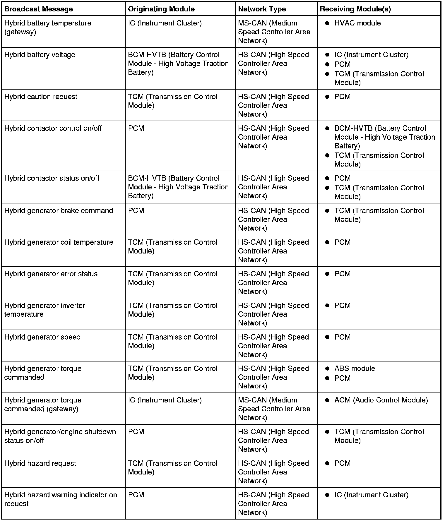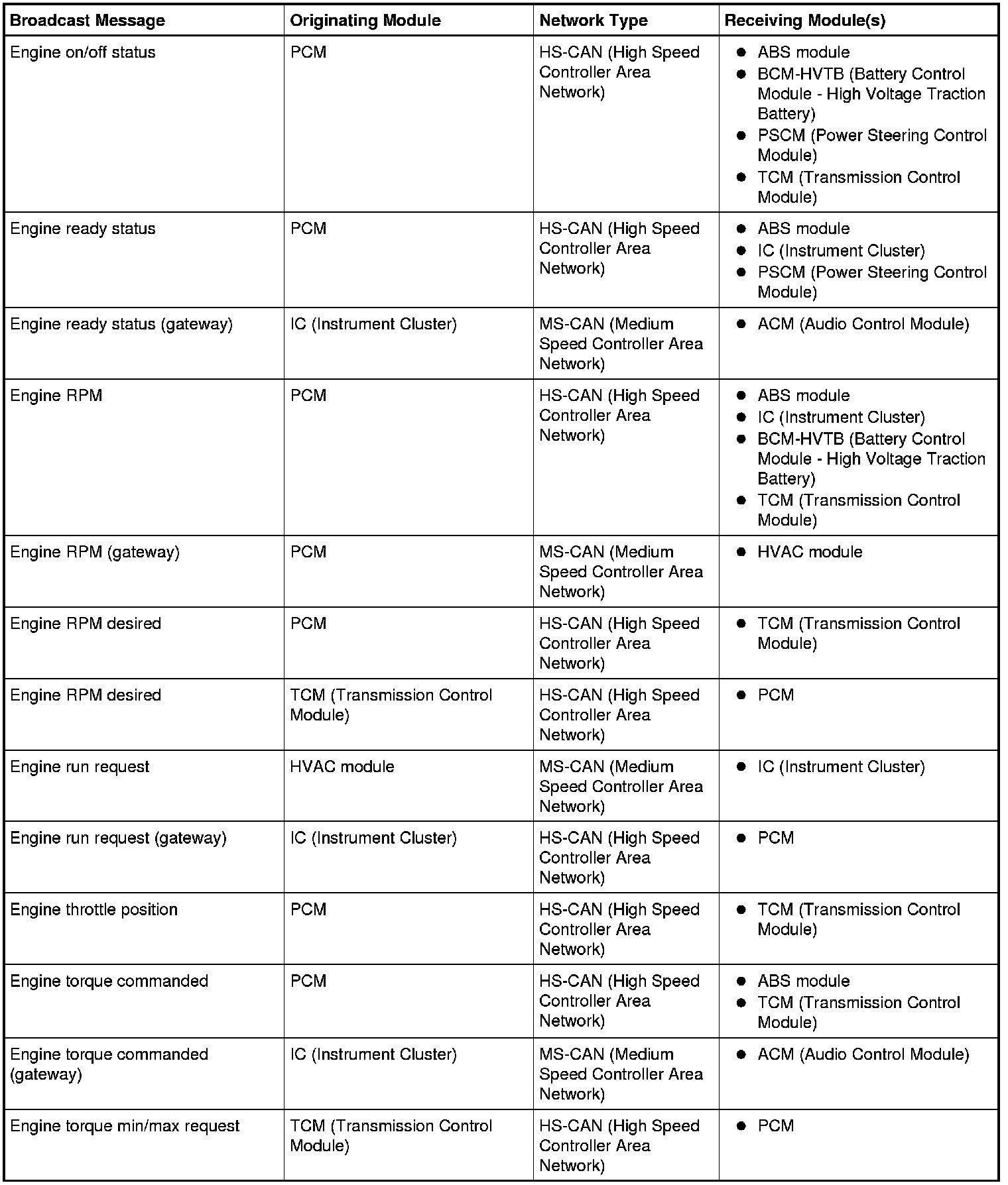 CAN (Controller Area Network) Module Communication Message Chart - Hybrid