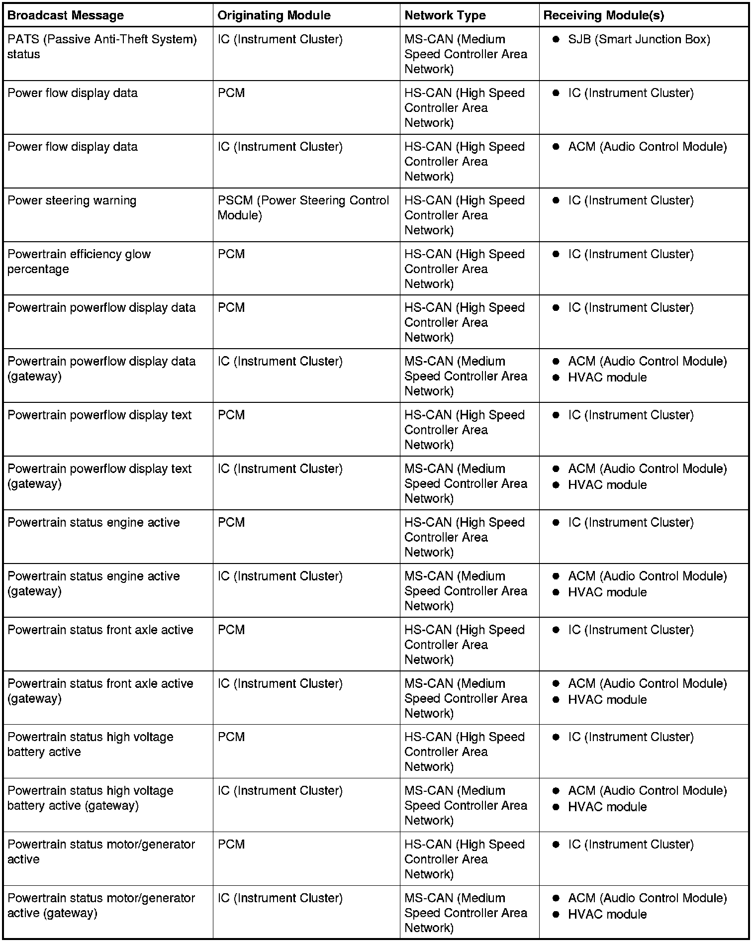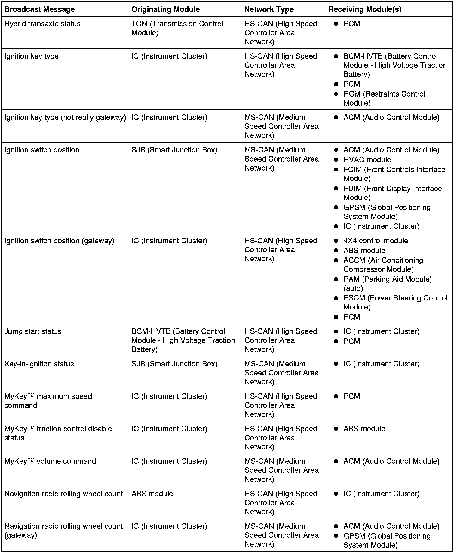Modules on the CAN (Controller Area Network) utilize simultaneous communication of 2 or more messages on the same network circuits. The following chart summarizes the messages sent and received on the network.