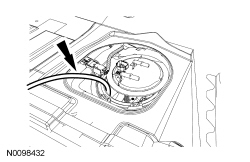 Connect the Fuel Storage Tanker to the fuel tank filler pipe recirculation tube port on the FP (Fuel Pump) module and remove approximately one-fourth of the fuel (from a completely full tank), lowering the fuel level below the FP (Fuel Pump) module mounting flange.