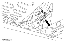 7. From under the rear of the passenger seat, slide and disengage the passenger seat side air bag module electrical connector locking clip, and then release the tab and disconnect the passenger seat side air bag module electrical connector.