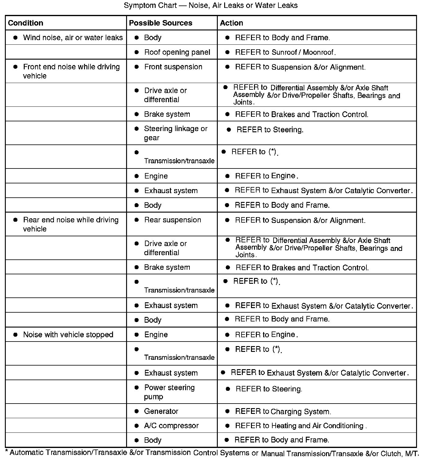 Symptom Chart - Noise, Air Leaks or Water Leaks