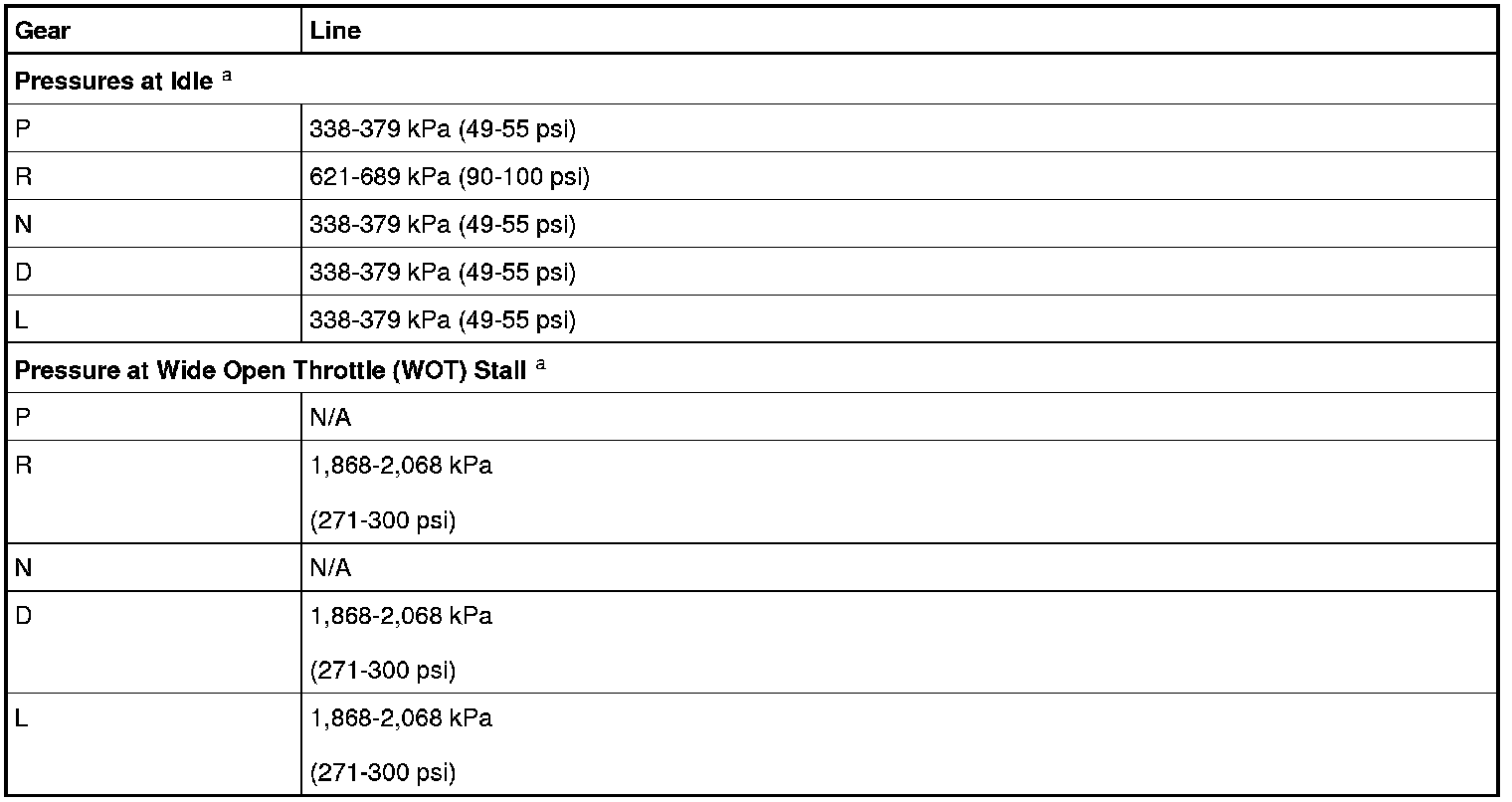 NOTICE: Carry out the Line Pressure Test prior to carrying out the Stall Speed Test. If the line pressure is low at stall, do not carry out the Stall Speed Test or further transaxle damage will occur. Do not maintain Wide Open Throttle (WOT) in any range for more than 5 seconds.