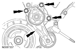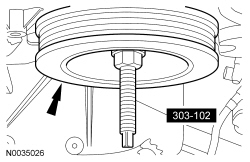 82. NOTICE: Failure to use the correct special tools, assembled as shown in the illustration, will result in damage to the coolant pump pulley and/or special tools.