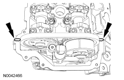 Apply an 8 mm (0.31 in) dot of silicone gasket and sealant at the cylinder block to front cover mating surface and the cam seal retainer-to-cylinder head joints.