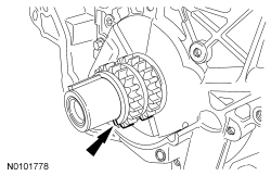 - Using the Camshaft Pulley Installer, Power Steering Pump Pulley Installer and the Water Pump Pulley Spacer, install a new service coolant pump pulley flush with the end of the camshaft.