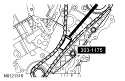 16. NOTICE: The Timing Chain Locking Tool must be installed square to the timing chain and the engine block or damage may result.