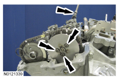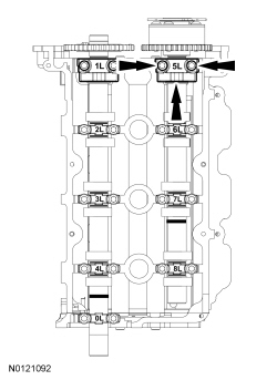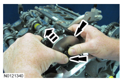 Using your hands, press the LH camshaft phaser and sprocket bolts towards the rear of the engine while using a rocking motion to release the LH camshaft phaser and sprocket from the camshaft.