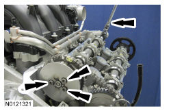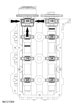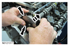 Using your hands, press the RH camshaft phaser and sprocket bolts towards the rear of the engine while using a rocking motion to release the RH camshaft phaser and sprocket from the camshaft.