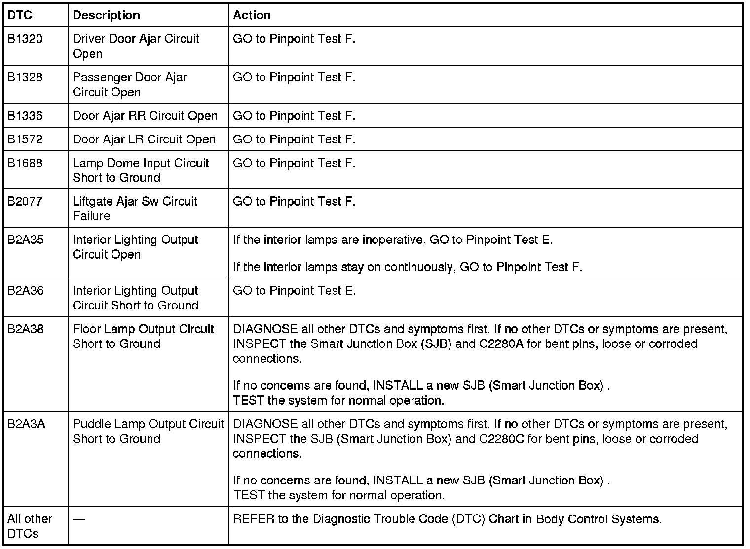 Smart Junction Box (SJB) DTC Chart
