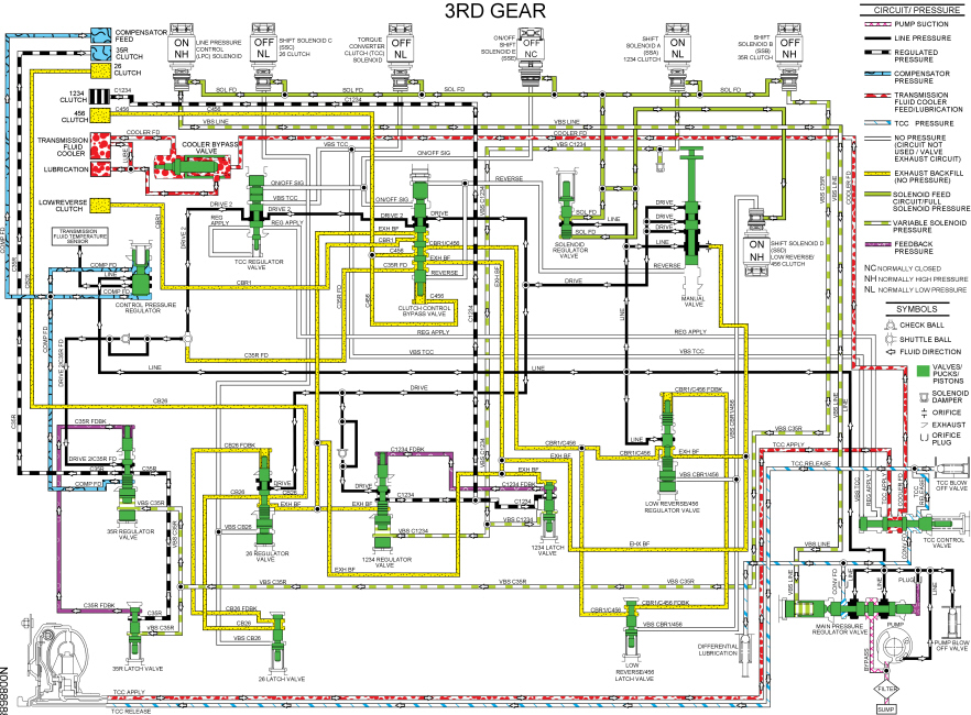 - Line pressure from the pump is directed to the clutch control bypass valve by the manual valve through the DRIVE hydraulic circuit. The clutch control bypass valve directs the pressure to the 35R regulator valve through the TCC (Torque Converter Clutch) regulator valve, DRIVE 2 circuit, DRIVE 2/C35R FD shuttle ball and DRIVE 2/C35R FD circuit. SSB (Shift Solenoid B) applies varying solenoid pressure to the 35R regulator and latch valves. As the regulator valve moves, it supplies the direct (3, 5, R) clutch and 35R latch valve with regulated line pressure through the C35R circuit. The 35R latch valve directs the regulated line pressure to the opposite side of the 35R regulator valve through the C35R FDBK circuit for gradual direct (3, 5, R) clutch engagement.