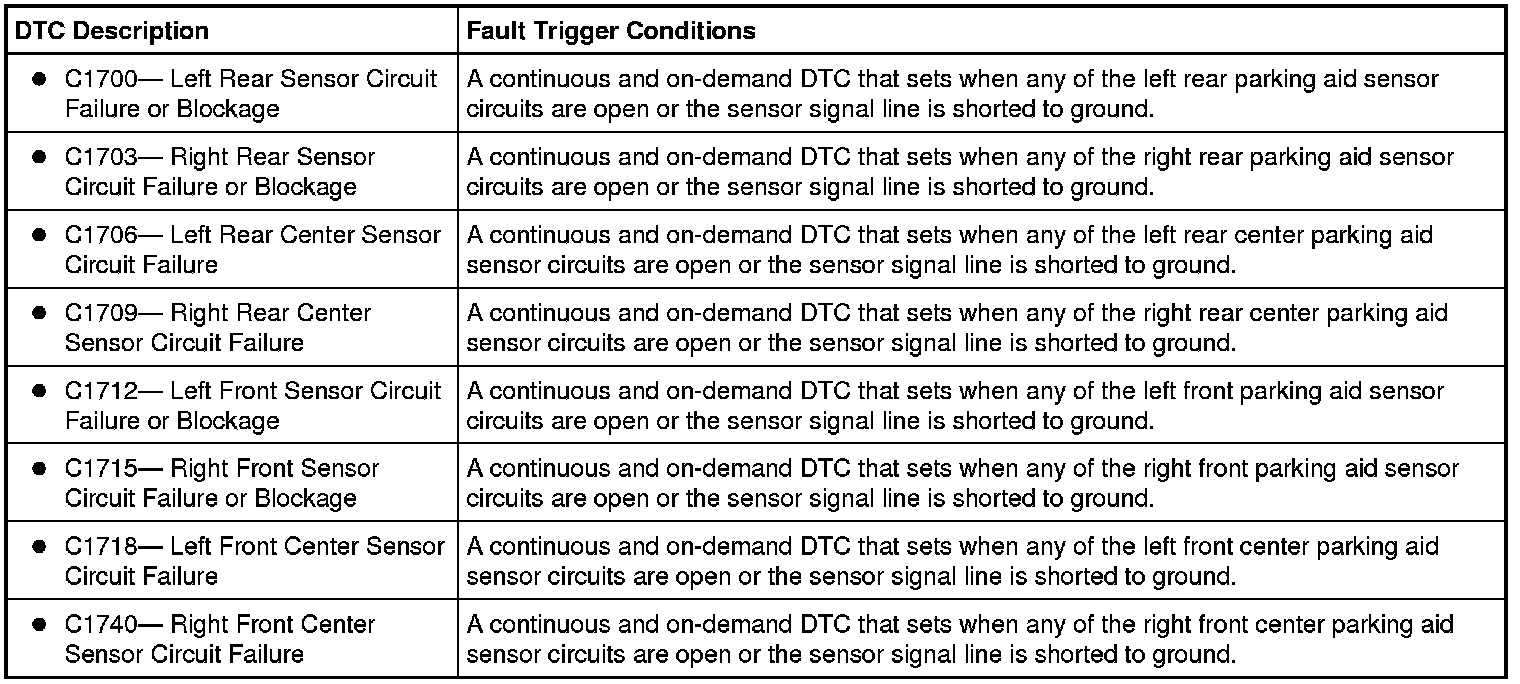 The Parking Aid Module (PAM) supplies voltage and ground signals to the rear parking aid sensors. The PAM (Parking Aid Module) receives a signal from the rear parking aid sensors and determines the distance of an object from the rear of the vehicle. If the PAM (Parking Aid Module) detects an open or a short to ground on any of the rear parking aid sensors circuits the PAM (Parking Aid Module) will set a DTC.