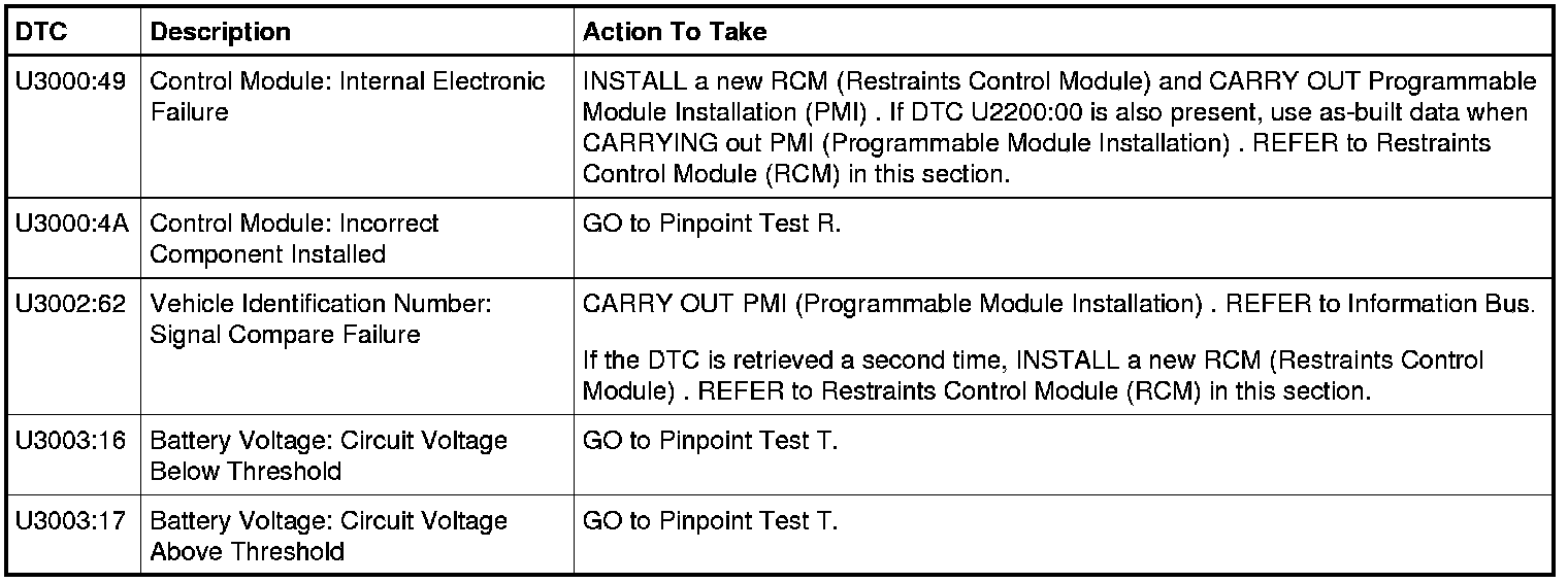 Restraints Control Module (RCM) DTC Chart