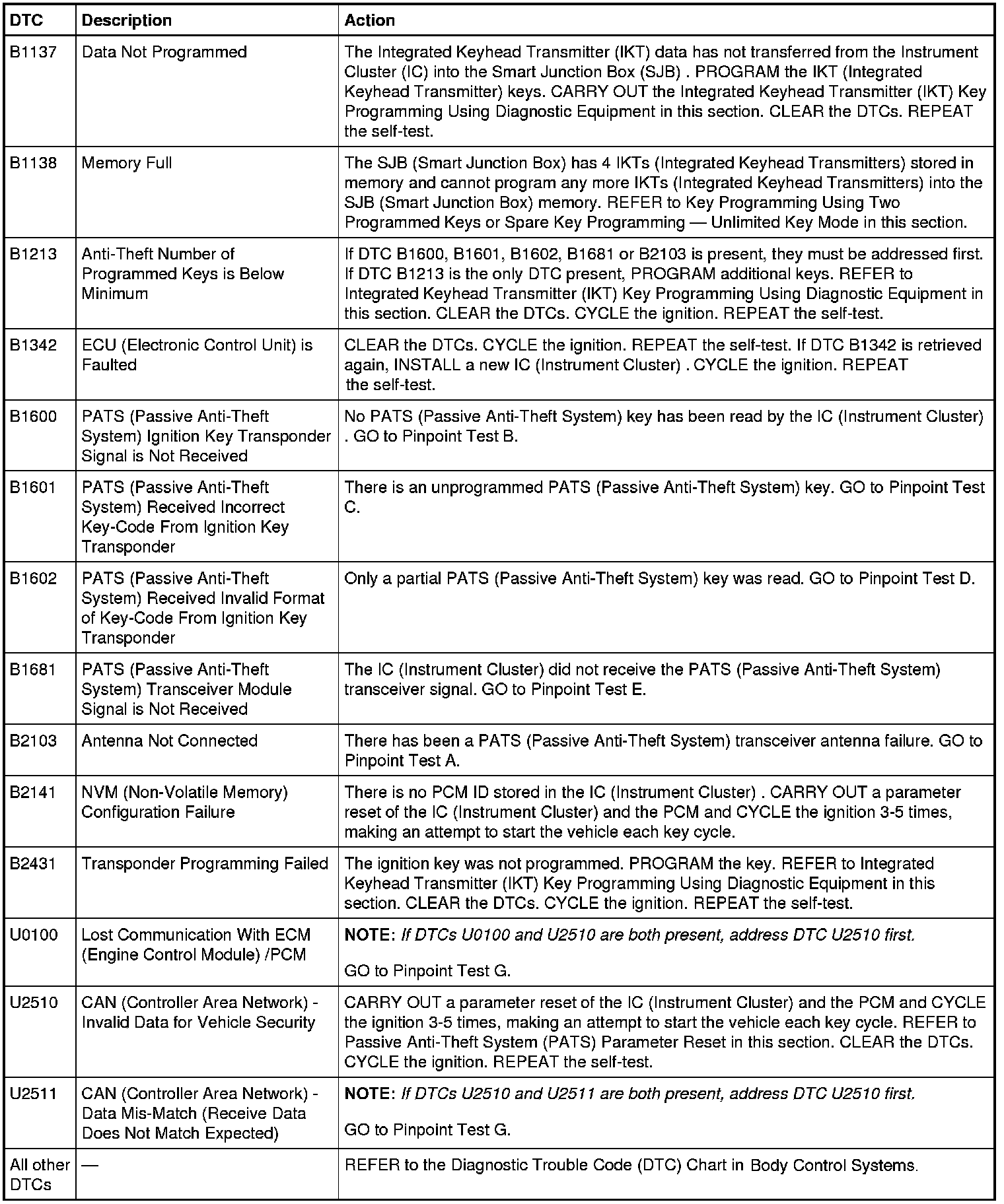 Instrument Cluster (IC) DTC Chart