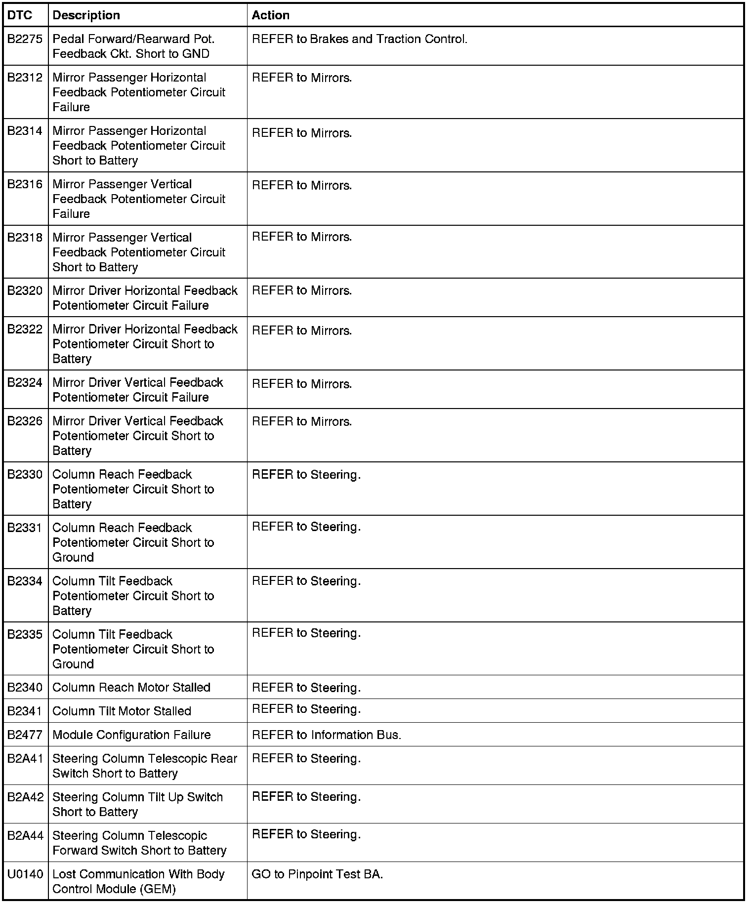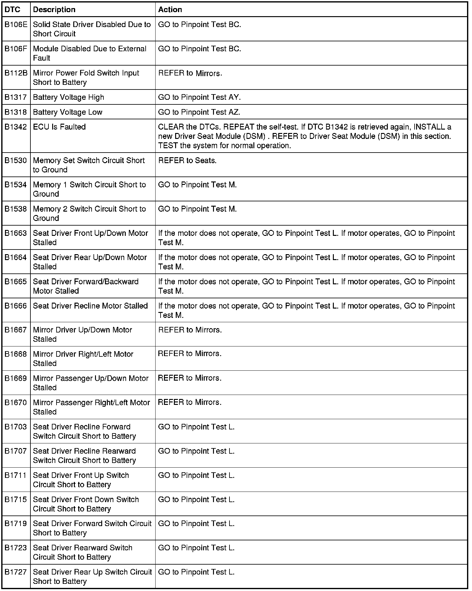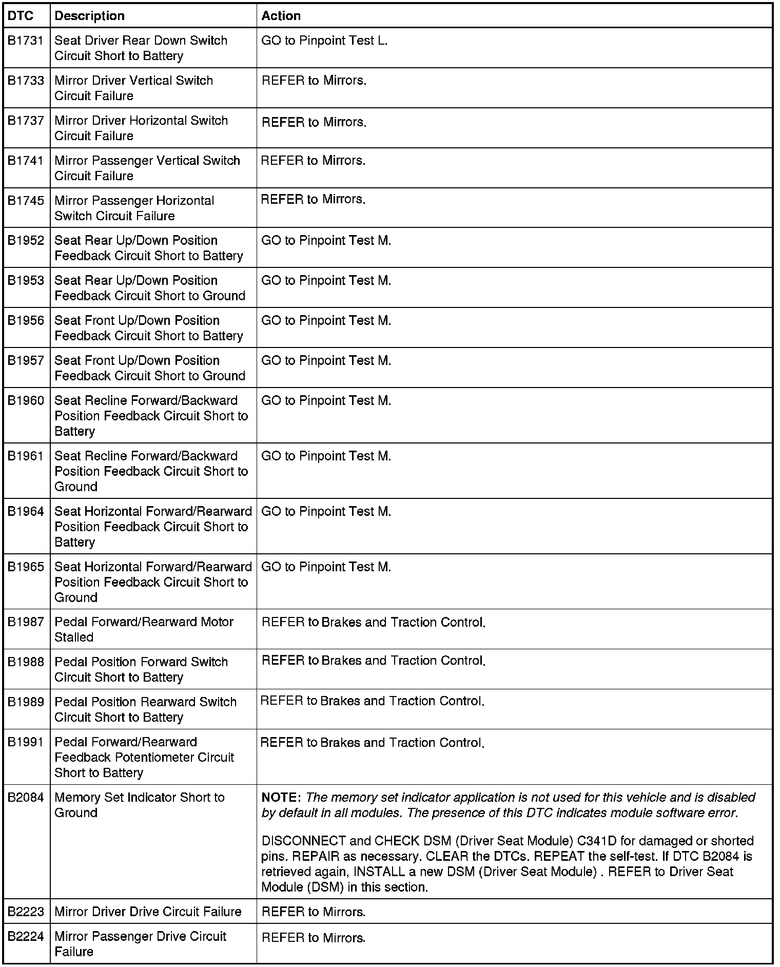 Driver Seat Module (DSM) DTC Chart
