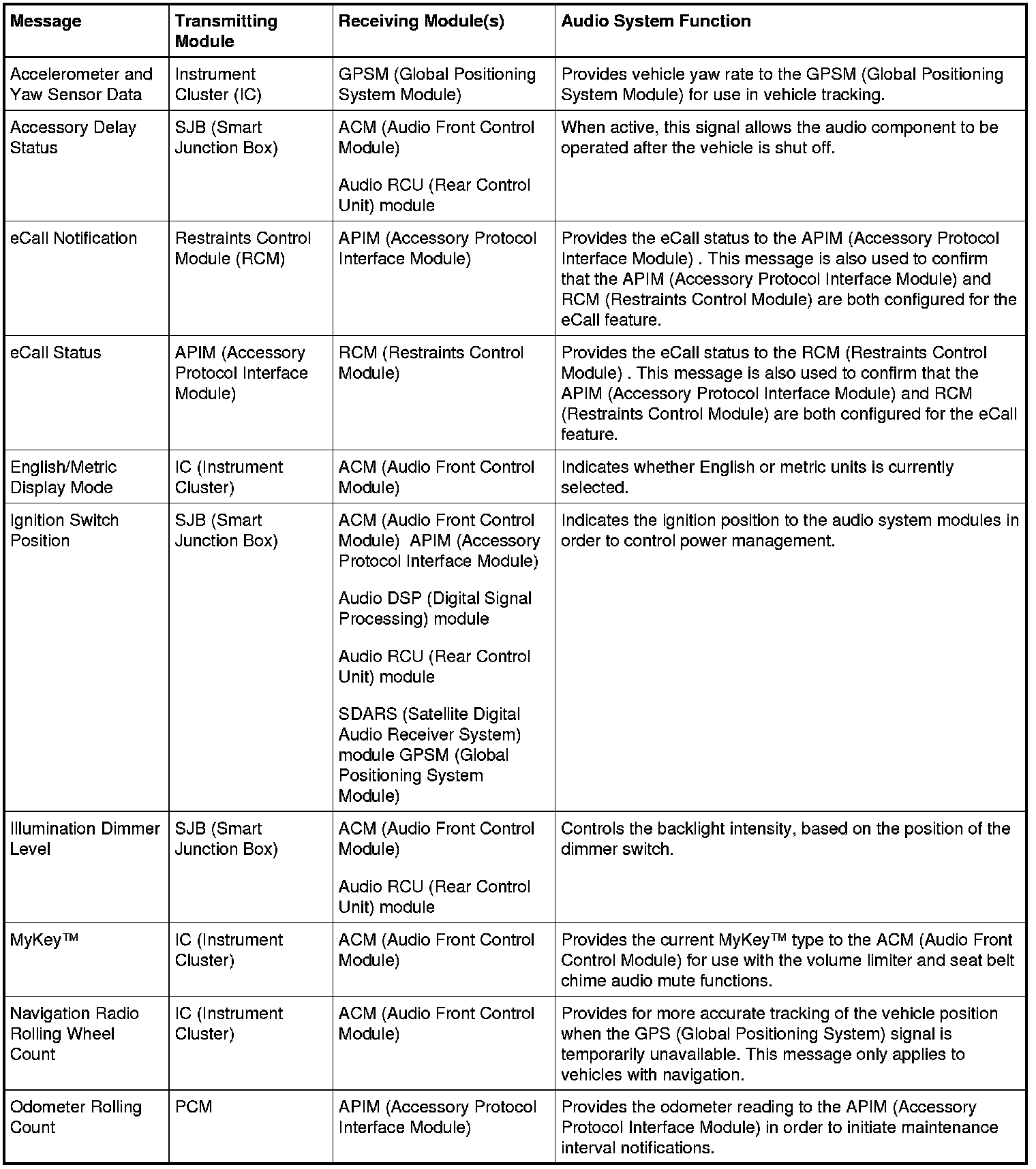 A mono signal is used for the microphone input to the APIM (Accessory Protocol Interface Module). The mono signal is also used for the voice prompts, the TTS (Text-To-Speech) feature, ringtones, and any audio received through a connected mobile phone. These audio signals are output from the APIM (Accessory Protocol Interface Module) to the ACM (Audio Front Control Module). The mono output from the APIM (Accessory Protocol Interface Module) utilizes separate circuits from the stereo output.