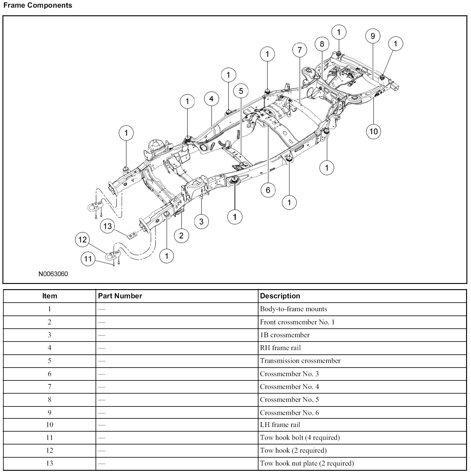 The frame is made up of 2 steel boxed side rails and crossmembers, which are welded to the 2 side rails. The transmission crossmember is bolted to the side rails. The side welded rails and crossmembers are not replaced separately.