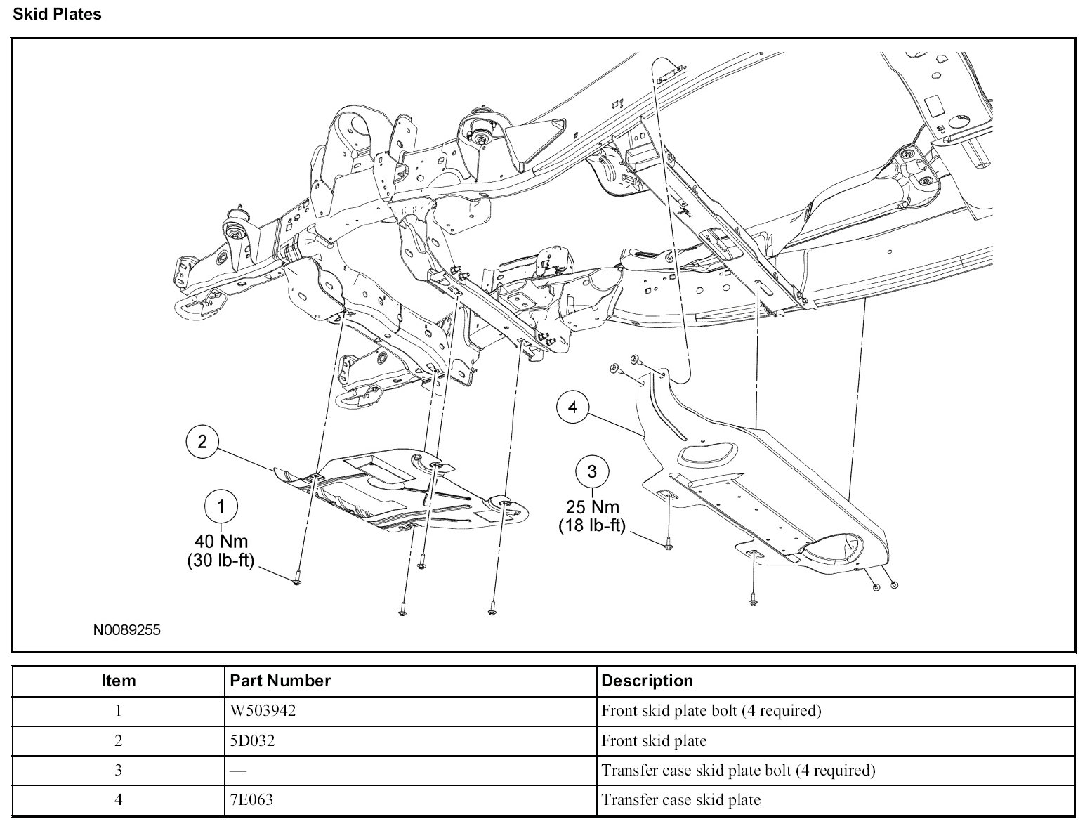 All frame-mounted heat shields, except the spare tire heat shield and the upper control arm heat shield, are tightened to 20 Nm (177 lb-in). The spare tire heat shield is tightened to 25 Nm (18 lb-ft). The upper control arm heat shield is tightened to 15 Nm (133 lb-in).
