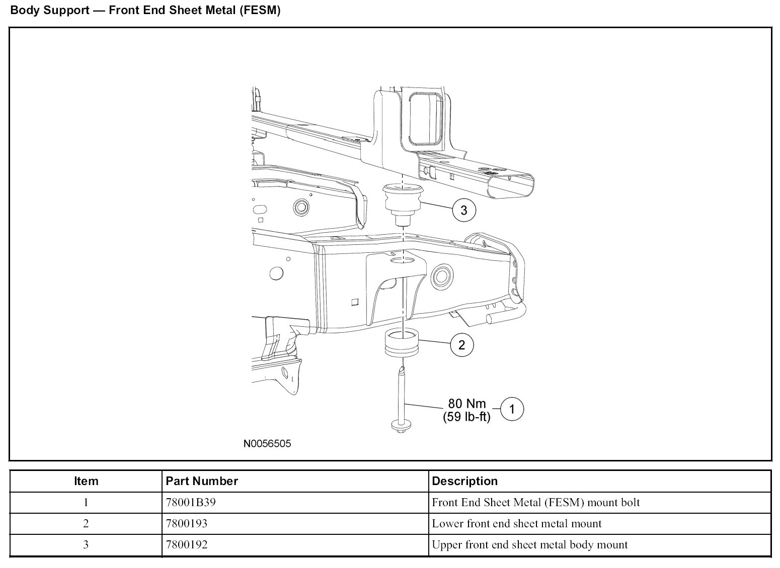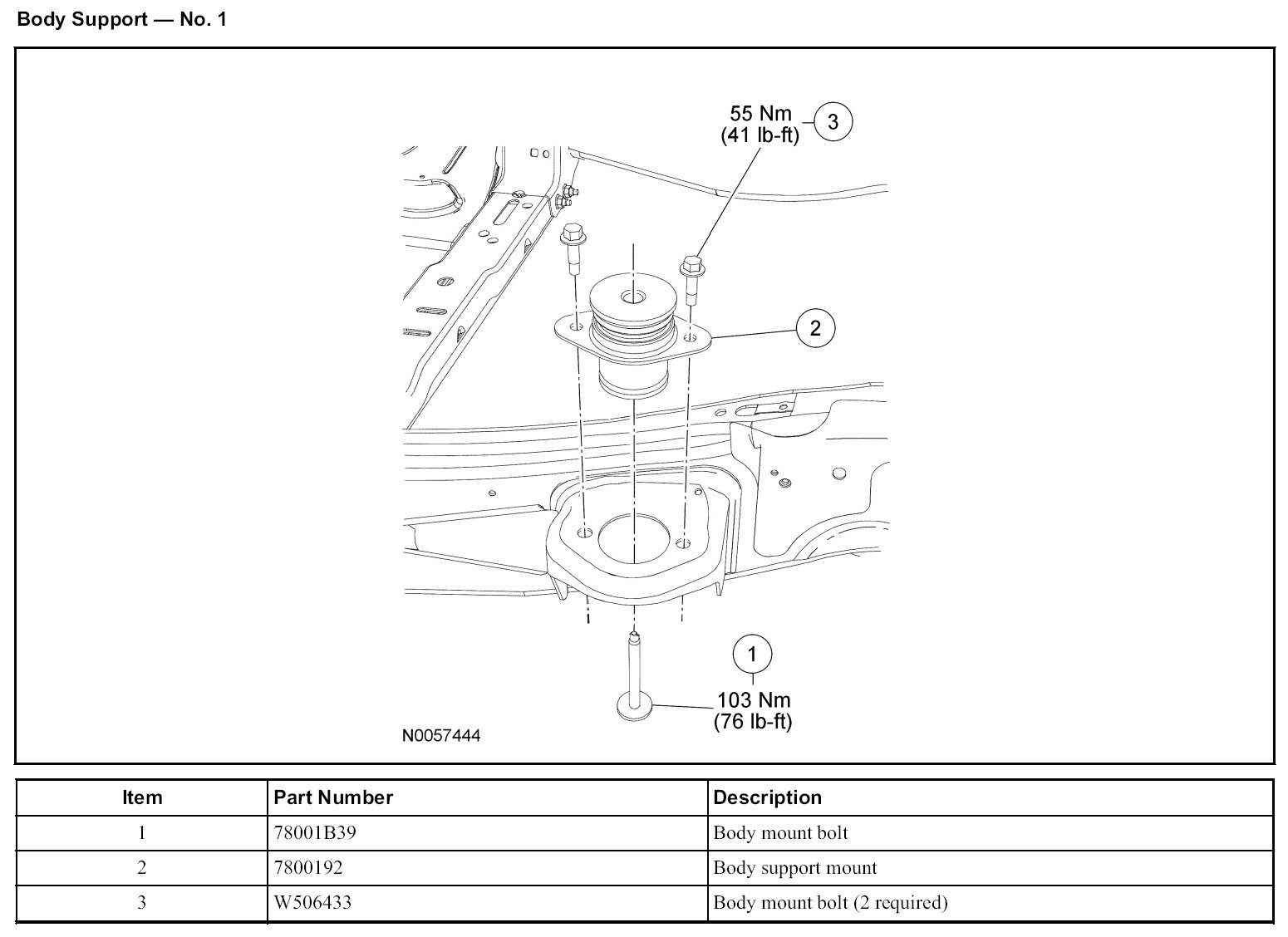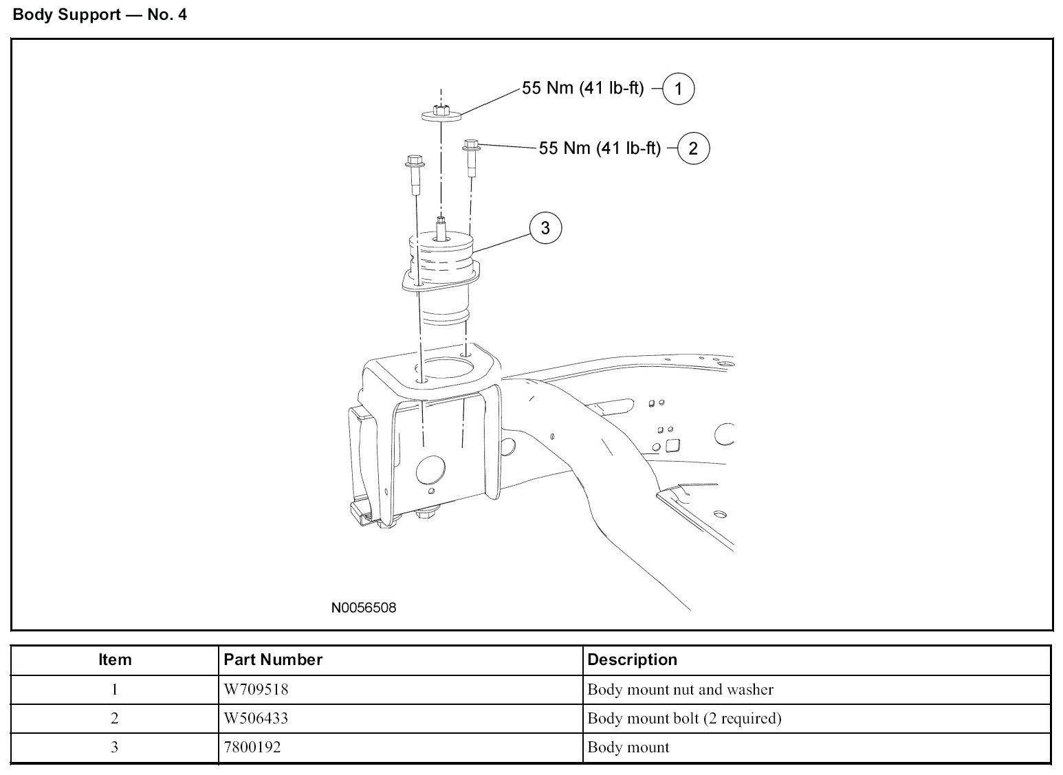 - Do not reuse body support mounting fasteners. New fasteners must be installed for each fastener that has been removed or loosened.