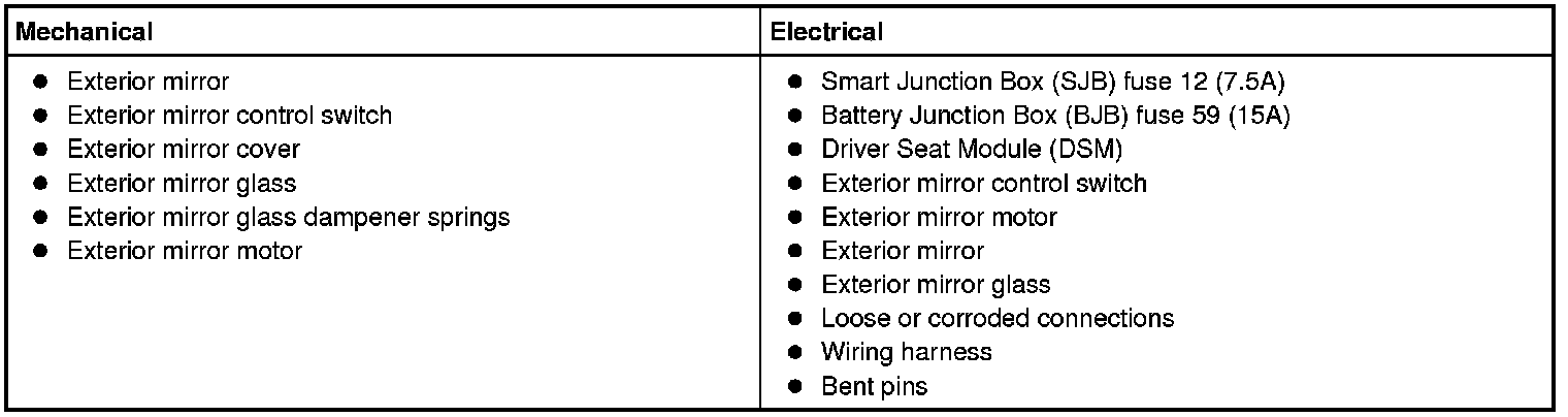 10. If no DTCs related to the concern are retrieved, GO to Symptom Chart- Exterior Mirrors or GO to Symptom Chart- NVH. Symptom Chart - Exterior Mirrors Symptom Chart - NVH