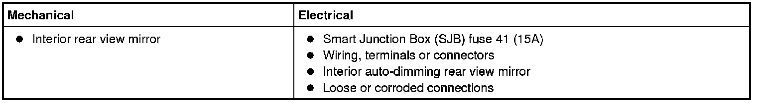 4. If the concern is not visually evident, verify the symptom and GO to Symptom Chart- Interior Mirror or GO to Symptom Chart- NVH. Symptom Chart - Interior Mirror Symptom Chart - NVH