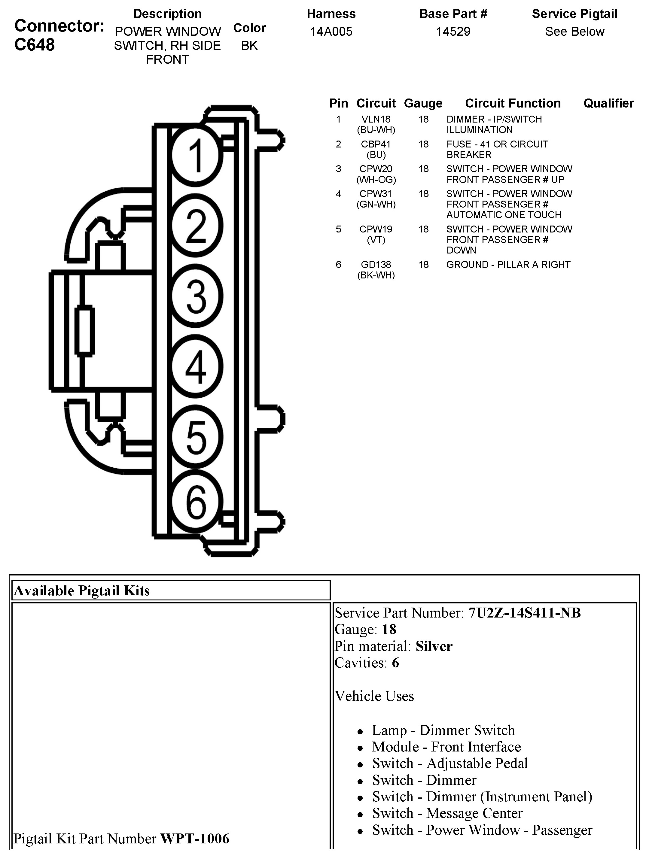 C648 Power Window Switch, RH Side Front