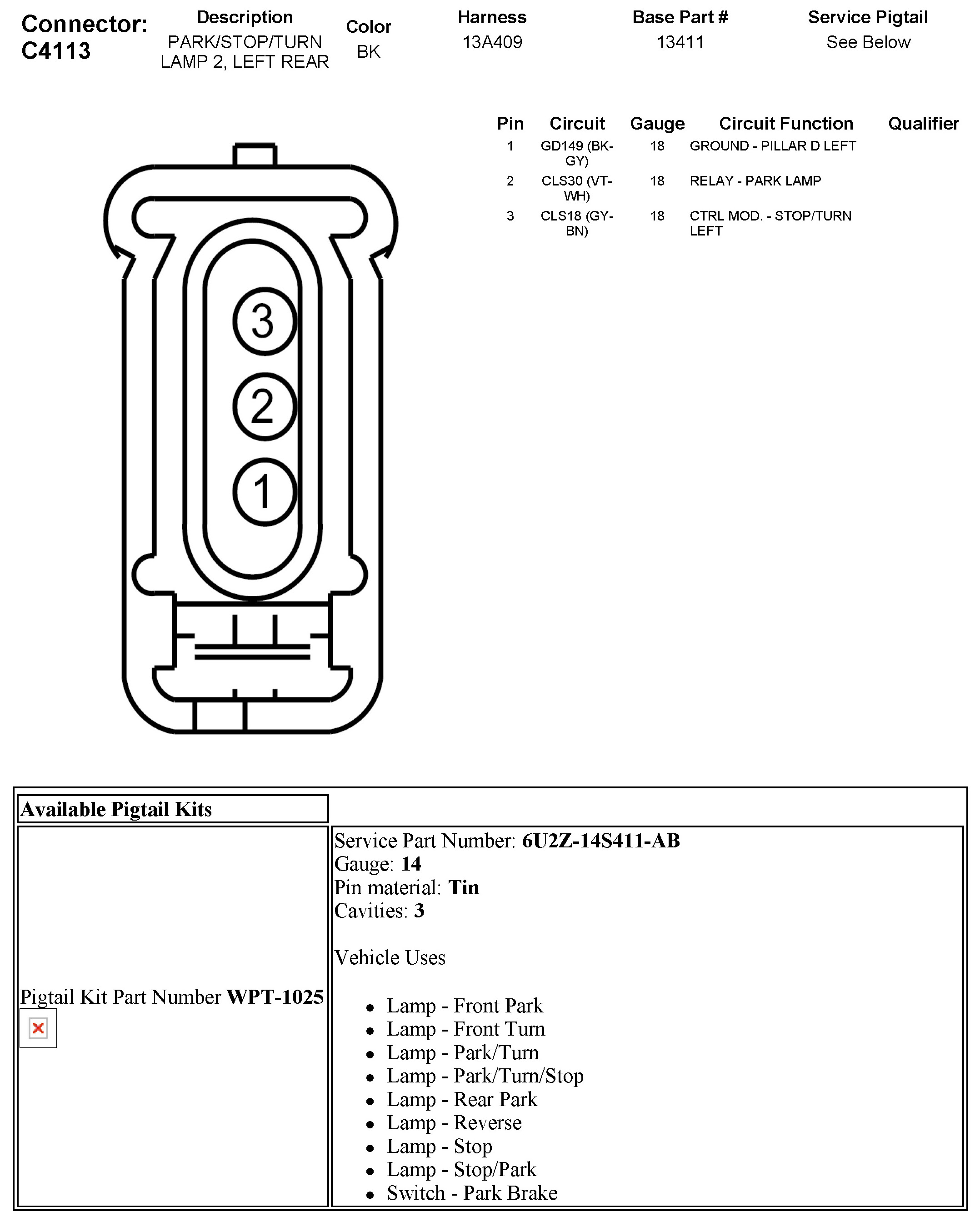 C4113 Park/Stop/Turn Lamp 2, Left Rear