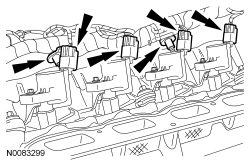 23. Connect the 4 RH ignition coil electrical connectors and the 2 engine wiring harness retainers to the RH valve cover studs.