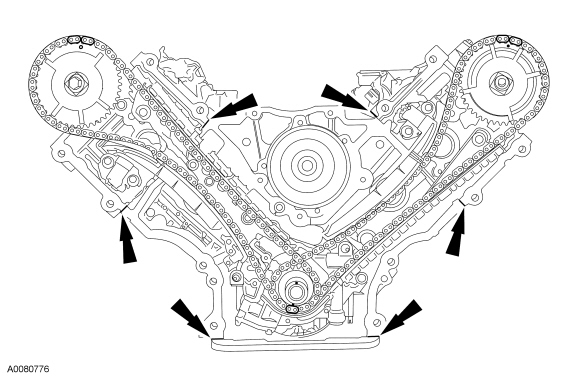 Apply a bead of silicone gasket and sealant along the cylinder head-to-cylinder block surface and the oil pan-to-cylinder block surface, at the locations shown.