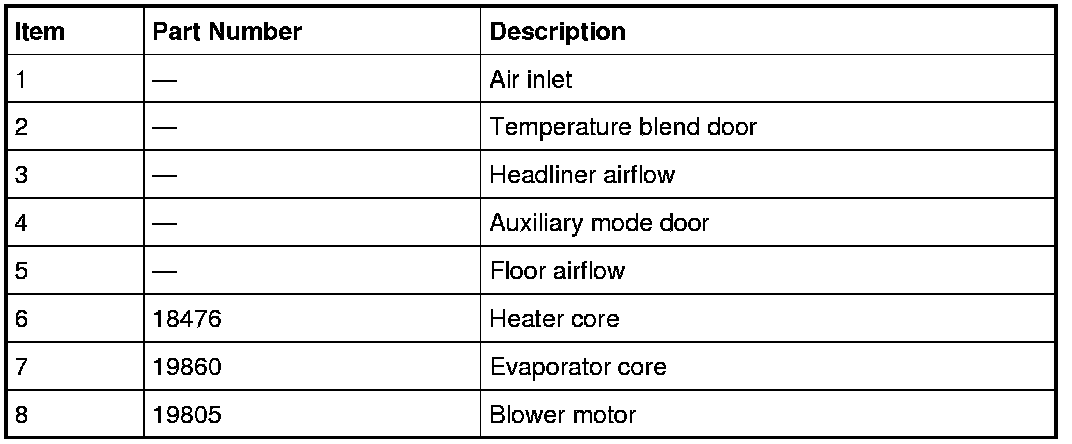 The evaporator core is an aluminum plate/fin type and is located in the auxiliary climate control housing. A mixture of refrigerant and oil enters the bottom of the evaporator core through the evaporator core inlet tube and then moves out of the evaporator core through the evaporator core outlet tube. When the A/C compressor is operating, air from the blower motor is cooled and dehumidified as it flows through the evaporator core fins.