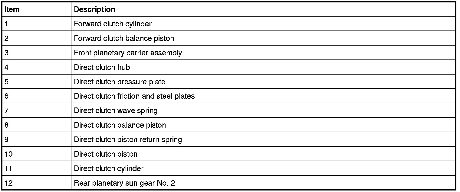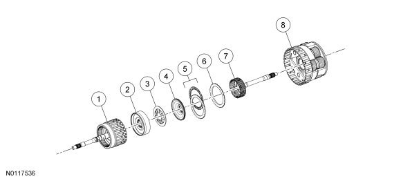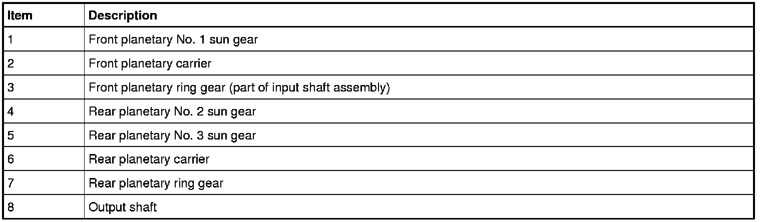The forward clutch (A) connects the front planetary carrier to the rear No. 3 sun gear. This provides a gear reduction ratio of 1.52:1 from the input shaft to rear sun gear No. 3. The forward clutch (A) is applied in 1st, 2nd, 3rd and 4th gears.