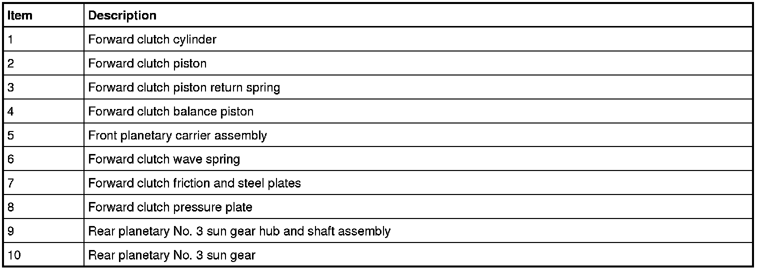 Regulated hydraulic pressure from the regulator valve in the valve body pushes the forward clutch (A) piston against the forward clutch (A) pack to apply the clutch. The front planetary carrier and the rear No. 3 sun gear are connected as a result of the clutch being applied.