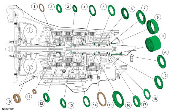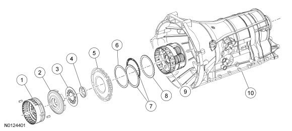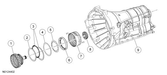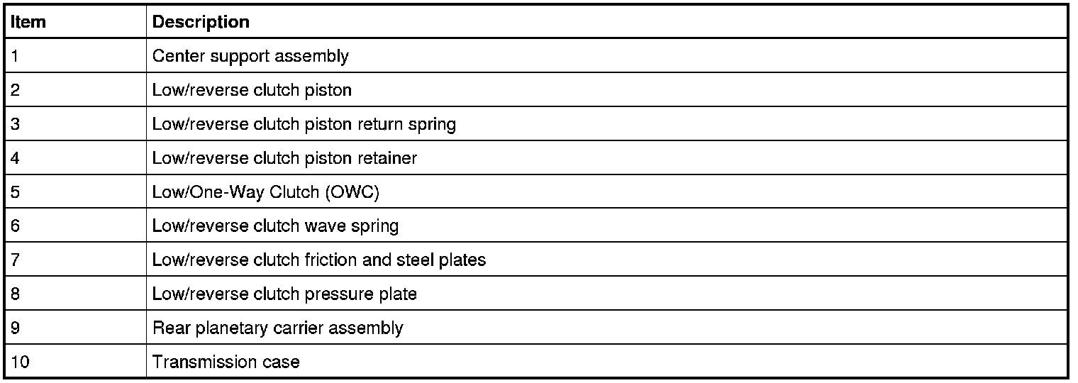 The low/reverse clutch (D) holds the rear planetary carrier stationary to the transmission case. The low/reverse clutch (D) is applied in park, reverse, neutral and 1st gear below 5 kph (3 mph).