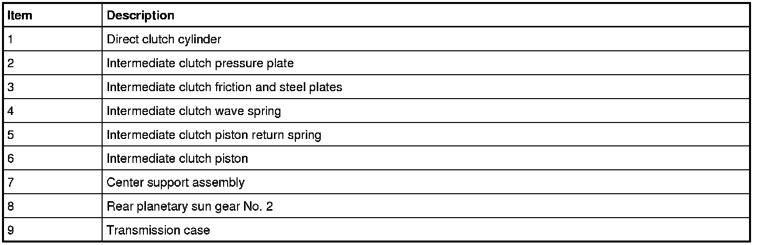The intermediate clutch (C) holds the rear planetary No. 2 sun gear stationary to the transmission case. The intermediate clutch (C) is applied in 2nd and 6th gears.