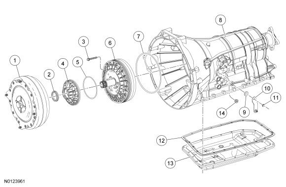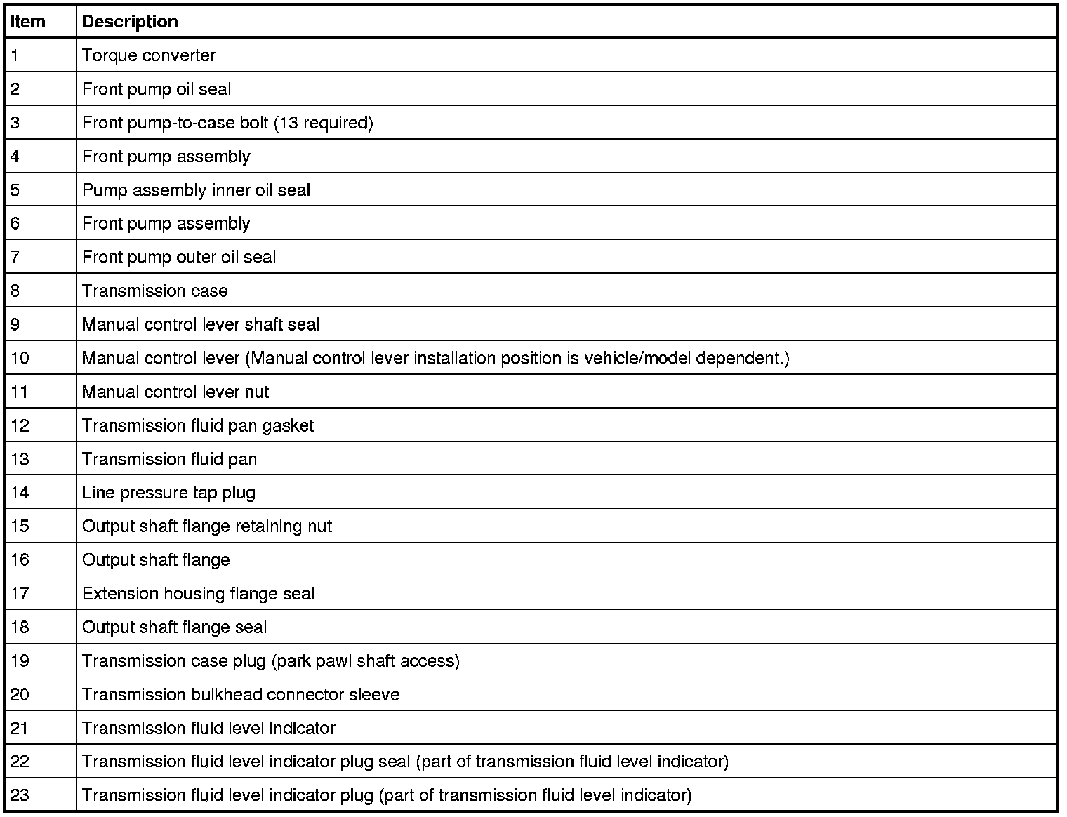 The pump assembly has a lip-type seal for the torque converter impeller hub. The pump assembly uses a large O-ring to seal the transmission case. The pump bolts also seal the pump to the transmission case.