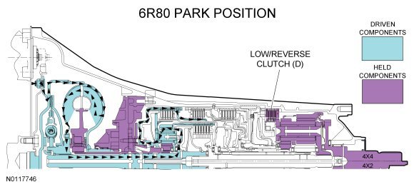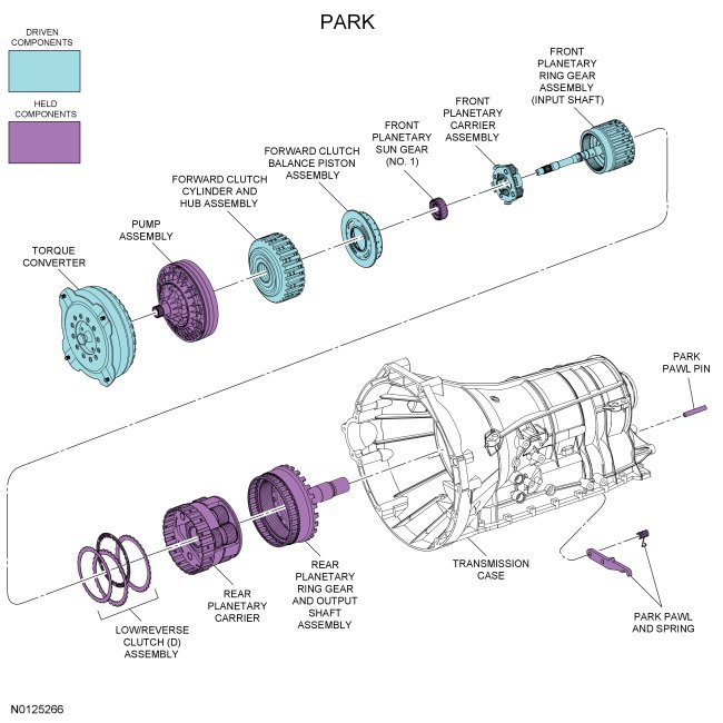 - Park pawl engaged holding the park gear (output shaft) stationary