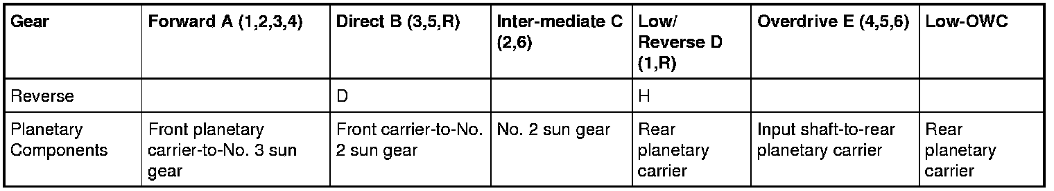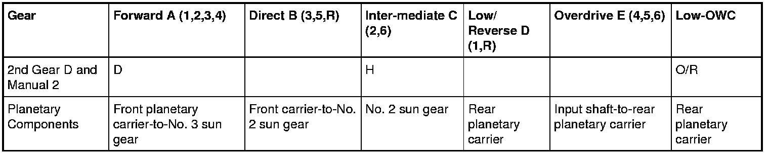 This transmission uses the following clutches to operate the 2 planetary gearsets: