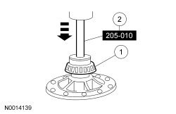 - Using a suitable press and the Drive Pinion Bearing Cone Installer, press the pinion bearing until it is firmly seated on the pinion gear.