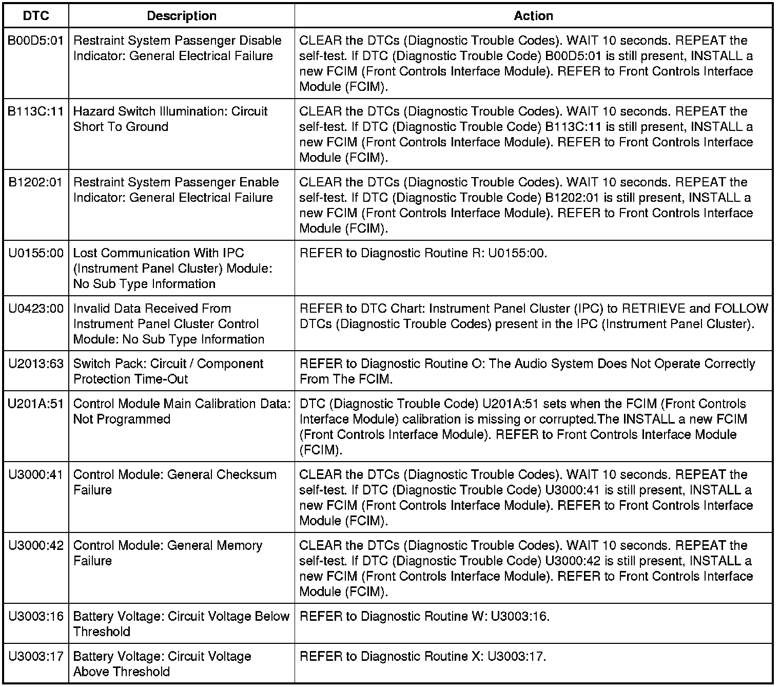 DTC Chart: Front Controls Interface Module (FCIM) - Premium Plus
