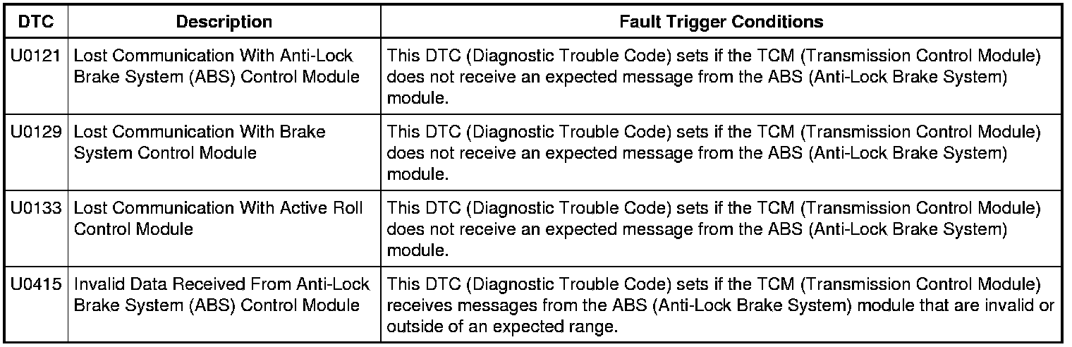 The TCM (Transmission Control Module) uses information contained in messages from the ABS (Anti-Lock Brake System) module sent on the HS-CAN (High Speed Controller Area Network).