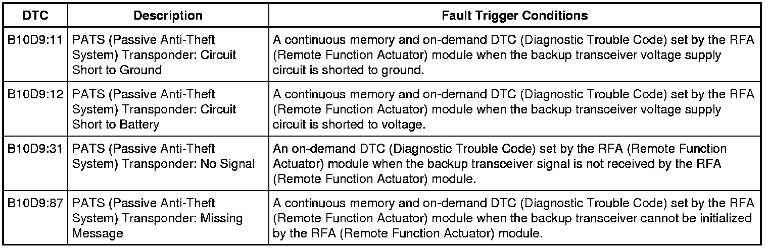 The RFA (Remote Function Actuator) module uses the backup transceiver to operate the PATS (Passive Anti-Theft System) in the event of a failure of any passive start antenna, a discharged battery in the IA (Intelligent Access) key, or a communication concern with the TPM (Tire Pressure Monitor) module. The backup transceiver is also used for IA (Intelligent Access) key programming.