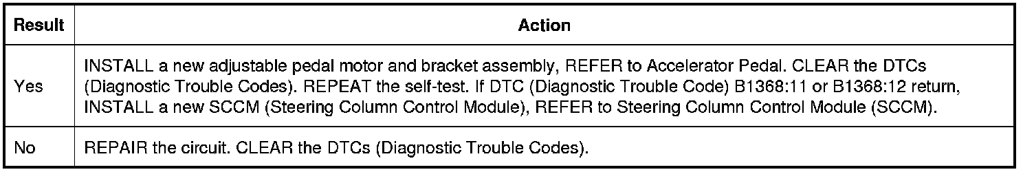 When the following DTCs (Diagnostic Trouble Codes) are set, the adjustable pedals enter a "jog mode". When the pedals are in jog mode, the memory system recall will not function from either the memory SET switch or the RKE (Remote Keyless Entry) feature. When the pedals are activated using the adjustable pedal switch, the motor will move the pedals for one second regardless of the length of time the button is actually pressed.