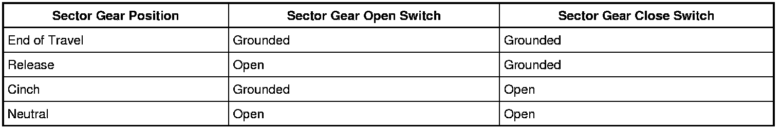 The sector gear open and close switches provide input to the LTM (Liftgate/Trunk Module) to determine the position of the sector gear. The sector gear is part of the latch assembly. It is driven by the latch motor and in turn drives the latch mechanism. During a release operation, the LTM (Liftgate/Trunk Module) deactivates the unlatch/cinching motor once the end of travel is reached. After a release operation, the LTM (Liftgate/Trunk Module) keeps the latch released until the gate moves away from the vehicle. The LTM (Liftgate/Trunk Module) then reverses the direction of the unlatch/cinching motor until the sector gear switches indicate the sector gear has returned to the neutral position. Refer to the following table for sector gear switch states: