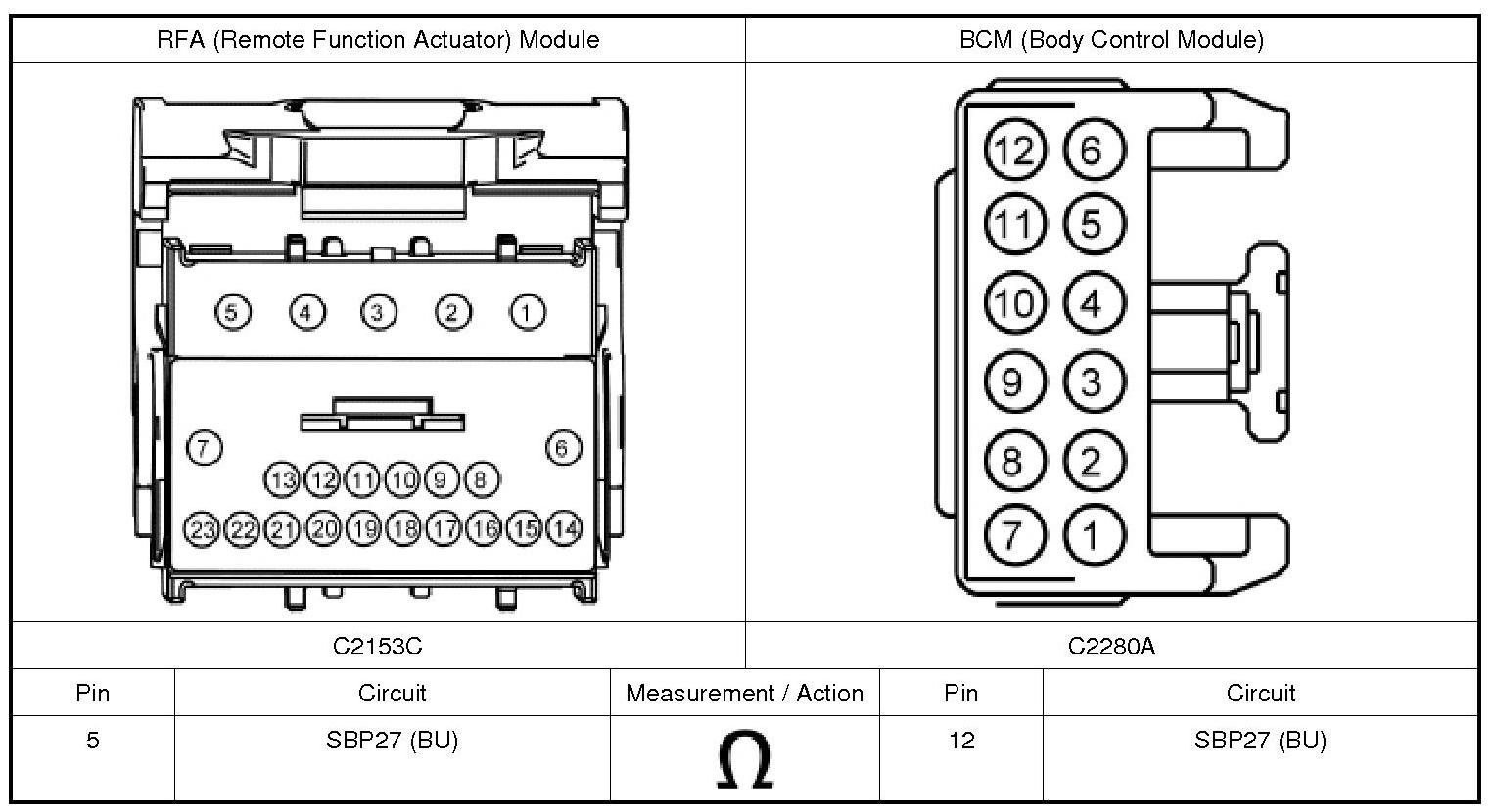 1. NOTE: If the BCM (Body Control Module) fuse 27 (20A) fails immediately upon installation, repair circuit SBP27 (BU) for a short to ground.