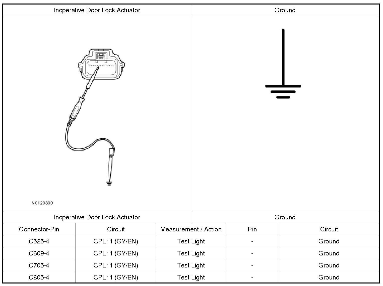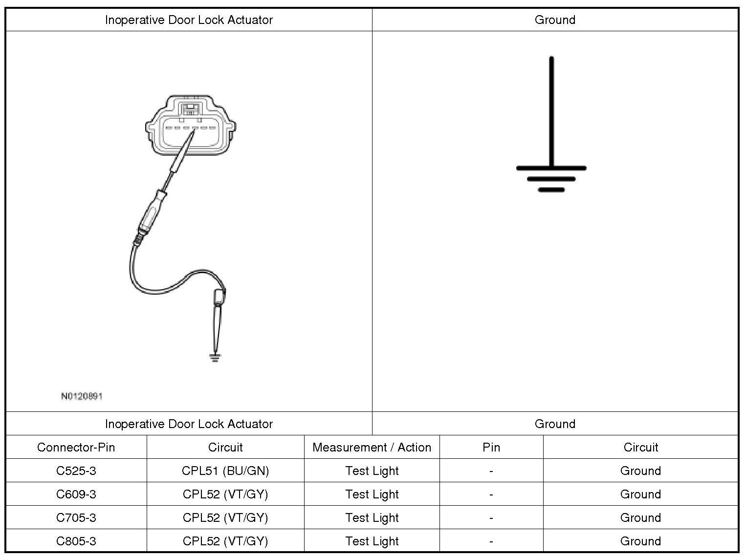 3. NOTE: The RFA (Remote Function Actuator) module only supplies voltage to the actuator momentarily. It is important to monitor the test light while pressing LOCK on a door lock control switch.