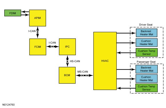 The driver and passenger heated seat control buttons and indicators are located on the touchscreen interface (FDIM (Front Display Interface Module)). The FDIM (Front Display Interface Module) is mounted directly to the APIM (Accessory Protocol Interface Module). The heated seat system functions independently of the vehicle's climate control system. Each time the heated seat button is pressed, the APIM (Accessory Protocol Interface Module) sends the request to the FCIM (Front Controls Interface Module) using the I-CAN (Infotainment Controller Area Network). The FCIM (Front Controls Interface Module) sends the message to the IPC (Instrument Panel Cluster) using the I-CAN (Infotainment Controller Area Network). The IPC (Instrument Panel Cluster) sends the request message to the BCM (Body Control Module) over the HS-CAN (High Speed Controller Area Network). Finally, the BCM (Body Control Module) sends the request to the HVAC (Heating, Ventilation, and Air Conditioning) module which decreases one setting (the sequence is high, low, off, high, etc.).