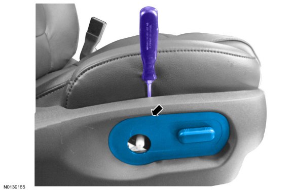 2. Insert a flat-blade screwdriver between the seat cushion and cushion side shield and release the rear retaining tab, while pulling the rear seat control switch bezel outward.